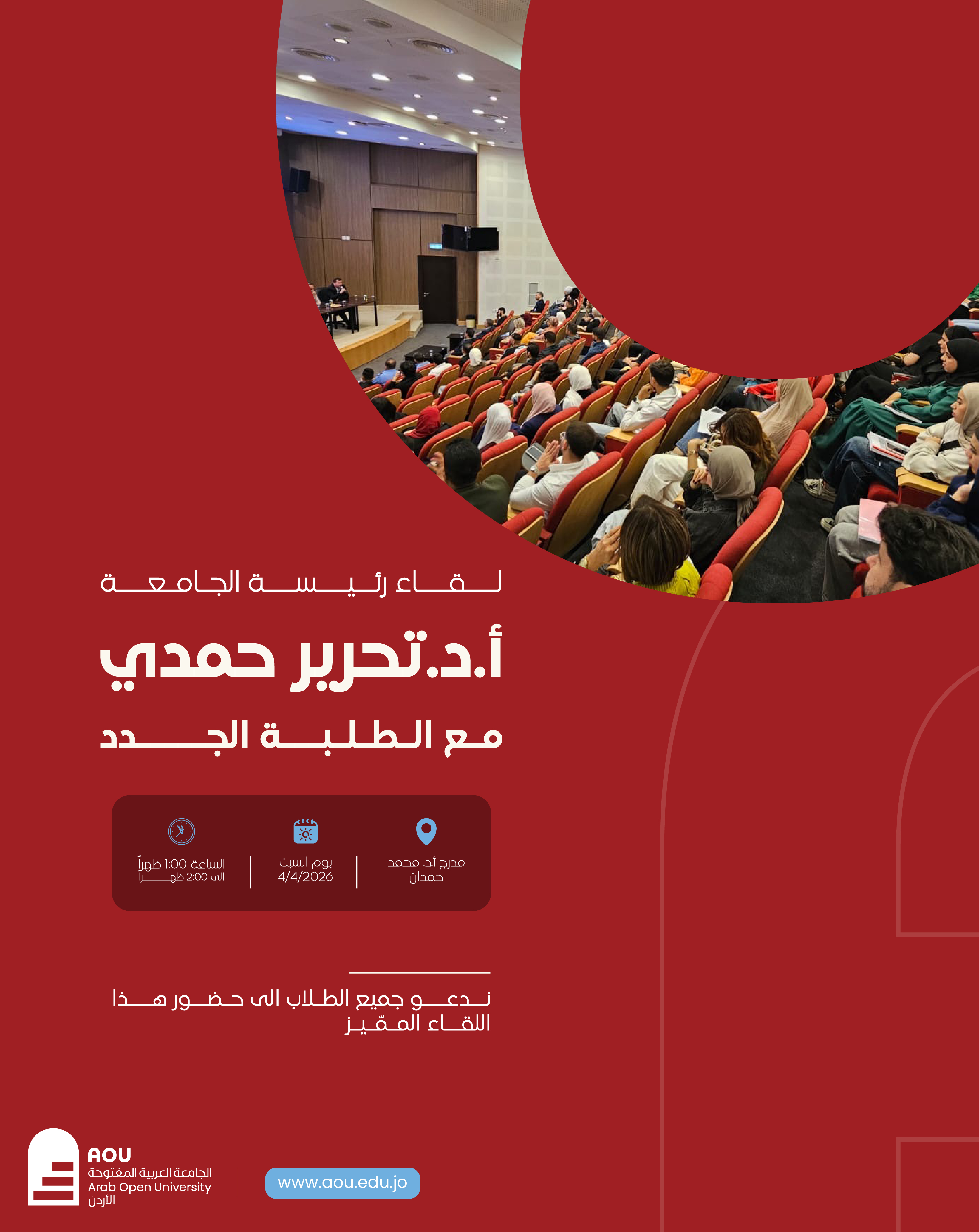 انطلاقًا من إيمان الجامعة بأن الطالب هو محور العملية التعليمية، تدعوكم عمادة شؤون الطلبة لحضور اللقاء الترحيبي للطلبة الجدد مع الأستاذة الدكتورة تحرير حمدي – رئيسة الجامعة العربية المفتوحة – الأردن،