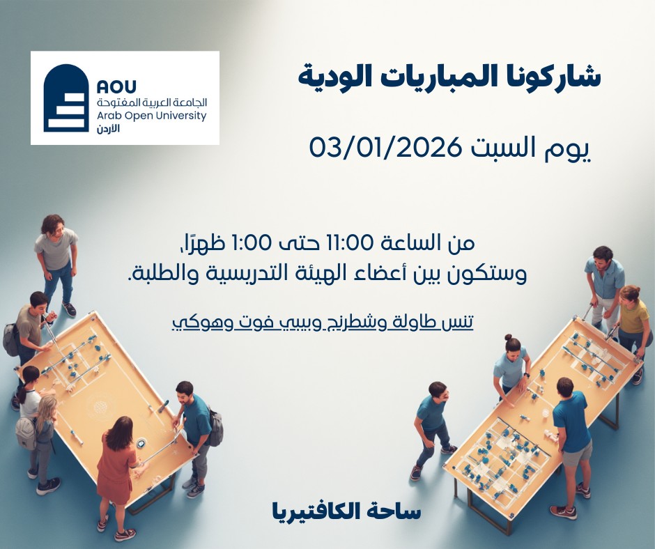 The Deanship of Student Affairs is pleased to invite you to attend the sports activity of friendly matches between faculty members and students. The event will take place on Saturday, 3 January 2026, from 11:00 a.m. to 1:00 p.m., in the cafeteria courtyard.