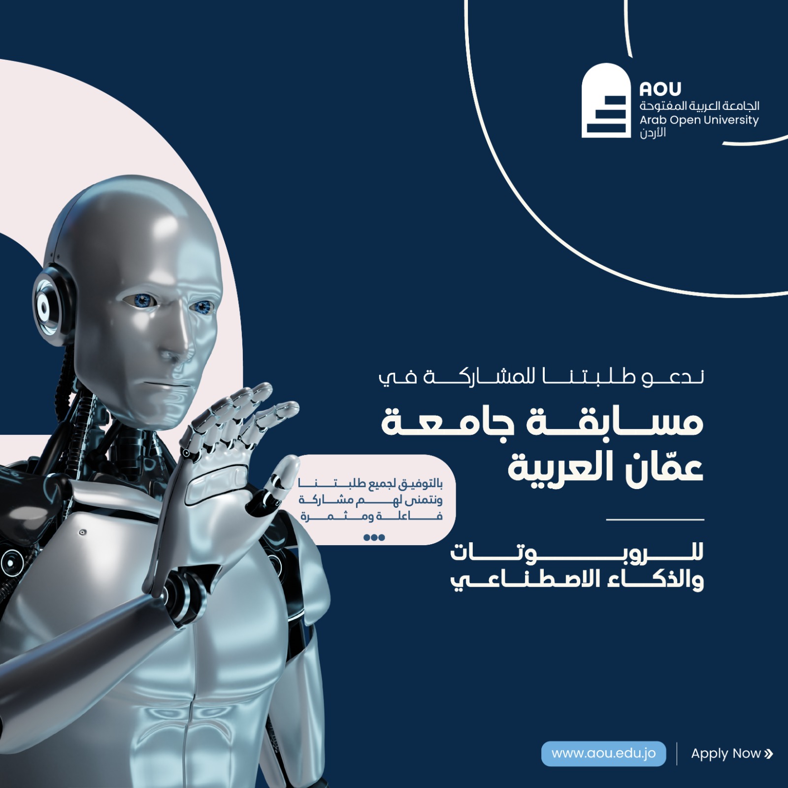 The Arab Open University / Jordan announces an invitation to its students to participate in the Arab Amman University Robotics and Artificial Intelligence Competition, the largest student event in the field of robotics and artificial intelligence (2026) at the level of Arab and regional universities and colleges, held under the patronage of His Excellency the Minister of Youth.