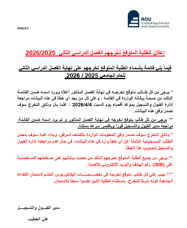 Announcement for students expected to graduate in the second semester of the 2025–2026 academic year.
