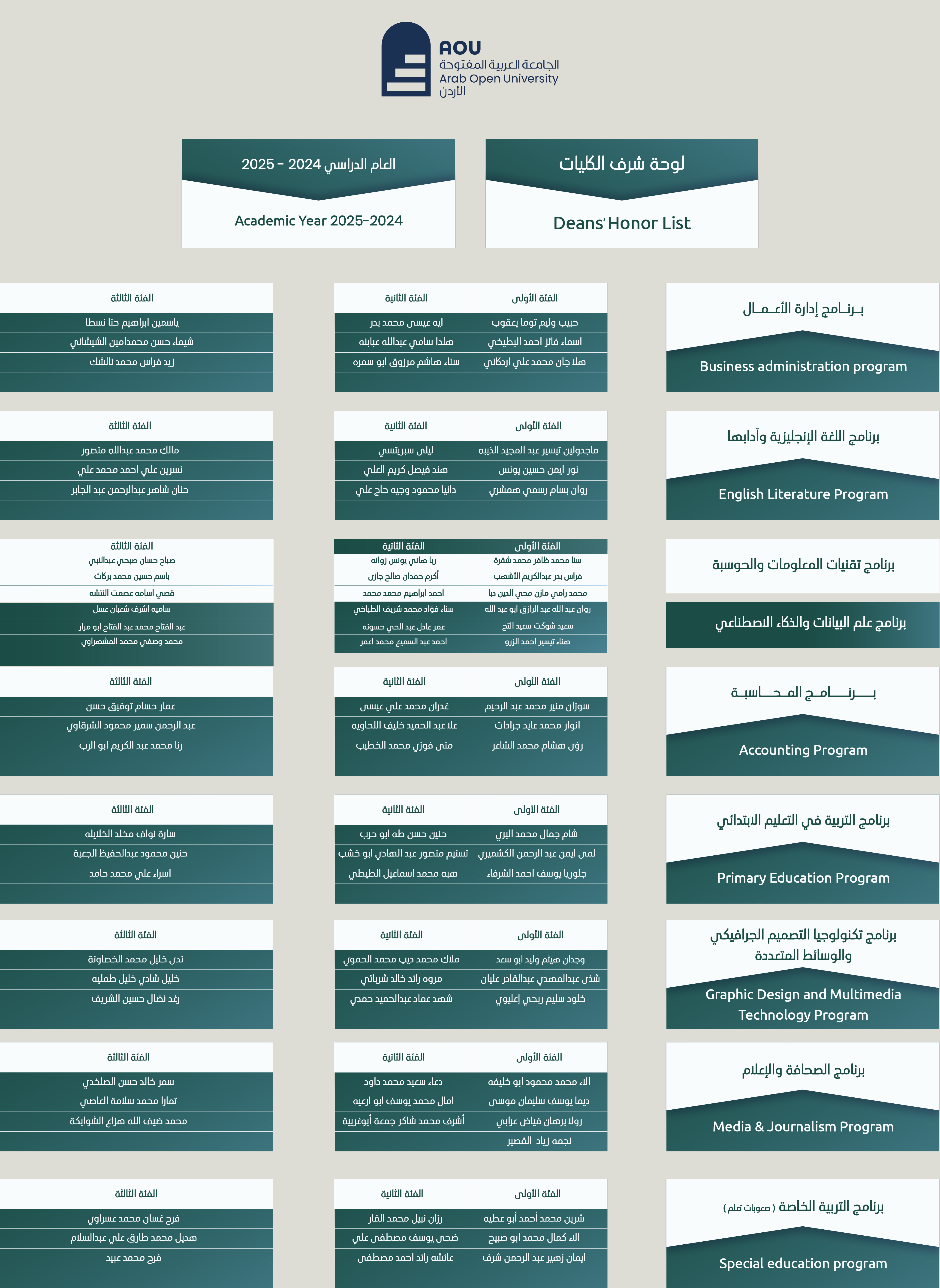 The Open University – Jordan has announced the names of the outstanding students listed on the Honor Roll for the academic terms of the 2024–2025 academic year, in recognition of their academic excellence and distinguished efforts across various specializations.